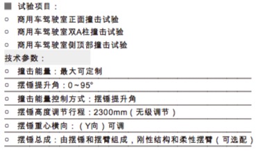 This equipment is for structural parts and fittings strength testing of commercial vehicle cab. Test items: Front impact Impact at A column Impact at top and side Technical parameters: ○ Impact energy: adjustable ○ Pendulum angle:0~95° ○ Impact energy control: pendulum lifting angle ○ Pendulum distance range:2300mm ○ Adjustable transverse center :( Y direction ) for pendulum ○ Pendulum: rigid hammer and flexible arm